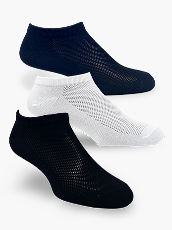 Pack x3 de medias tobilleras clásicas en microfibra, con malla de ventilación. Colores: blanco, negro y azul. Frescura y comodidad todo el día.